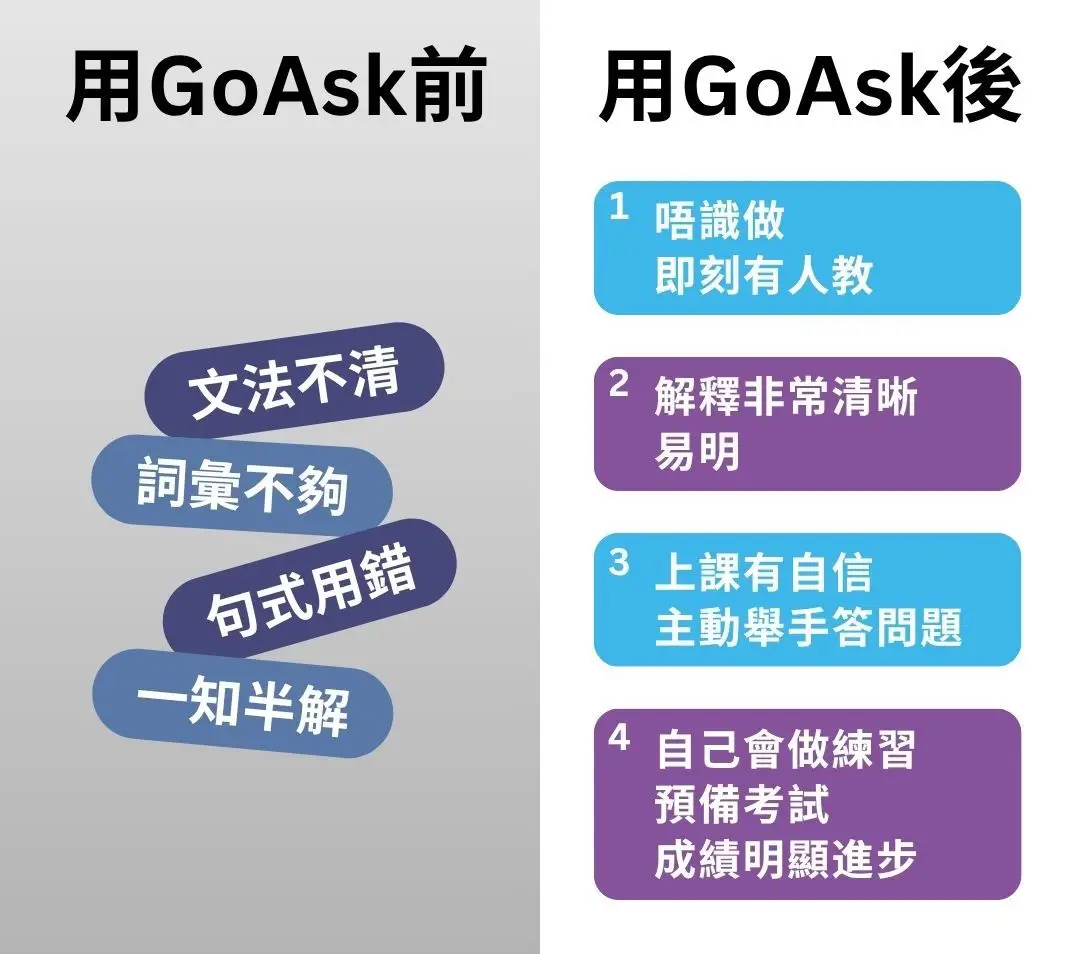 我哋有三十個學生用咗 GoAsk 幾個月,英文成績全部升晒,有啲以前唔合格嘅,而家差唔多個個都考到九十幾分!學生有進步,我哋做老師都好感動,GoAsk 真係好幫到手!