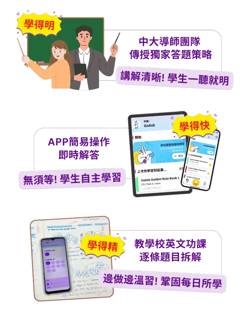 GoAsk 一個價錢,全家共享,100%對應教育局課程,學校教咩,我哋就幫你學咩。平時做功課可以用,仲可以用返上一年嘅題目溫習常犯錯誤,真正做到「學校教唔晒,GoAsk 幫你補返晒」。